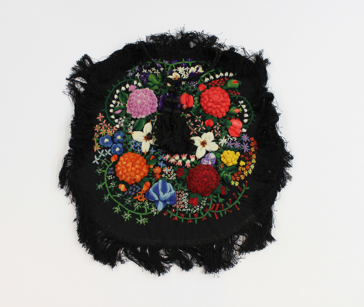 Circular embroidered mat, black ground with black fringe. Heavy worsted embroidery at center, featuring floral motifs in red, orange, blue, purple, white, pink, and green. At top, black cord attached to border, coming together at the center with two black tassels.