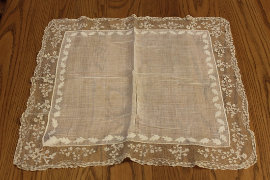 White cotton handkerchief - solid center with undulating line of single embroidered leaves in a border along edge of center of handkerchief. Net border with appliqued and embroidered floral decoration. Rounded corner.