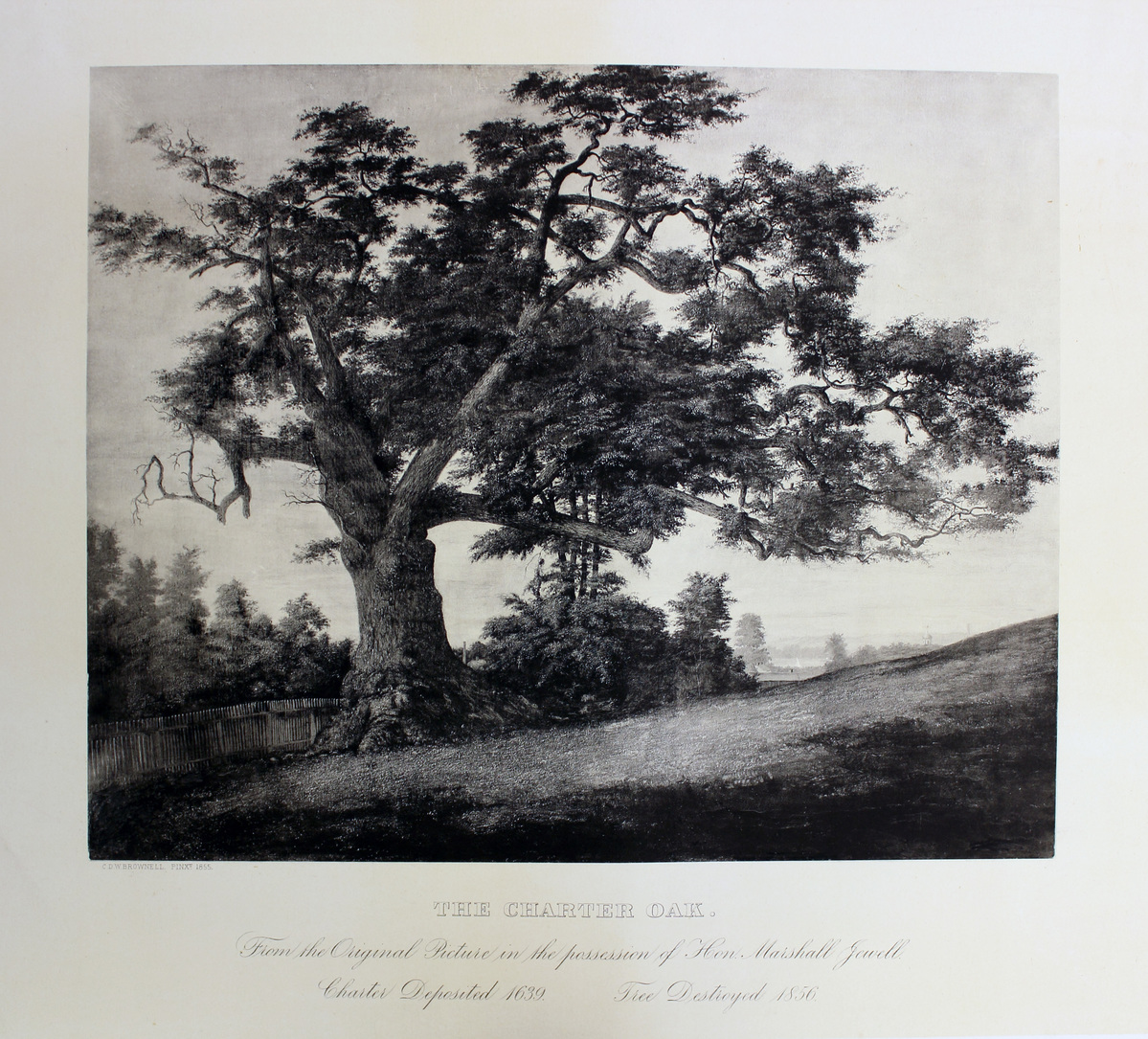 Engraving print depicting the Charter Oak and surrounding area, with lettering below “THE CHARTER OAK/ From the Original Picture in the possession of Hon. Marshall Jewell/ Charter Deposited 1639. Tree Destroyed 1856.”.