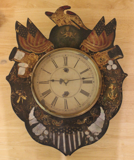 Papier mache wall clock manufactured by the Litchfield Manufacturing Company. This eight day "Navy Marine" design clock features a large central face under glass. Case made of wood and covered in black lacquer. Papier mache decorations around face feature painted and mother-of-pearl inlay images of canons, American flags, shells, and other nautically themed images. Remnants of a Litchfield Manufacturing Company label remain pasted to the back.