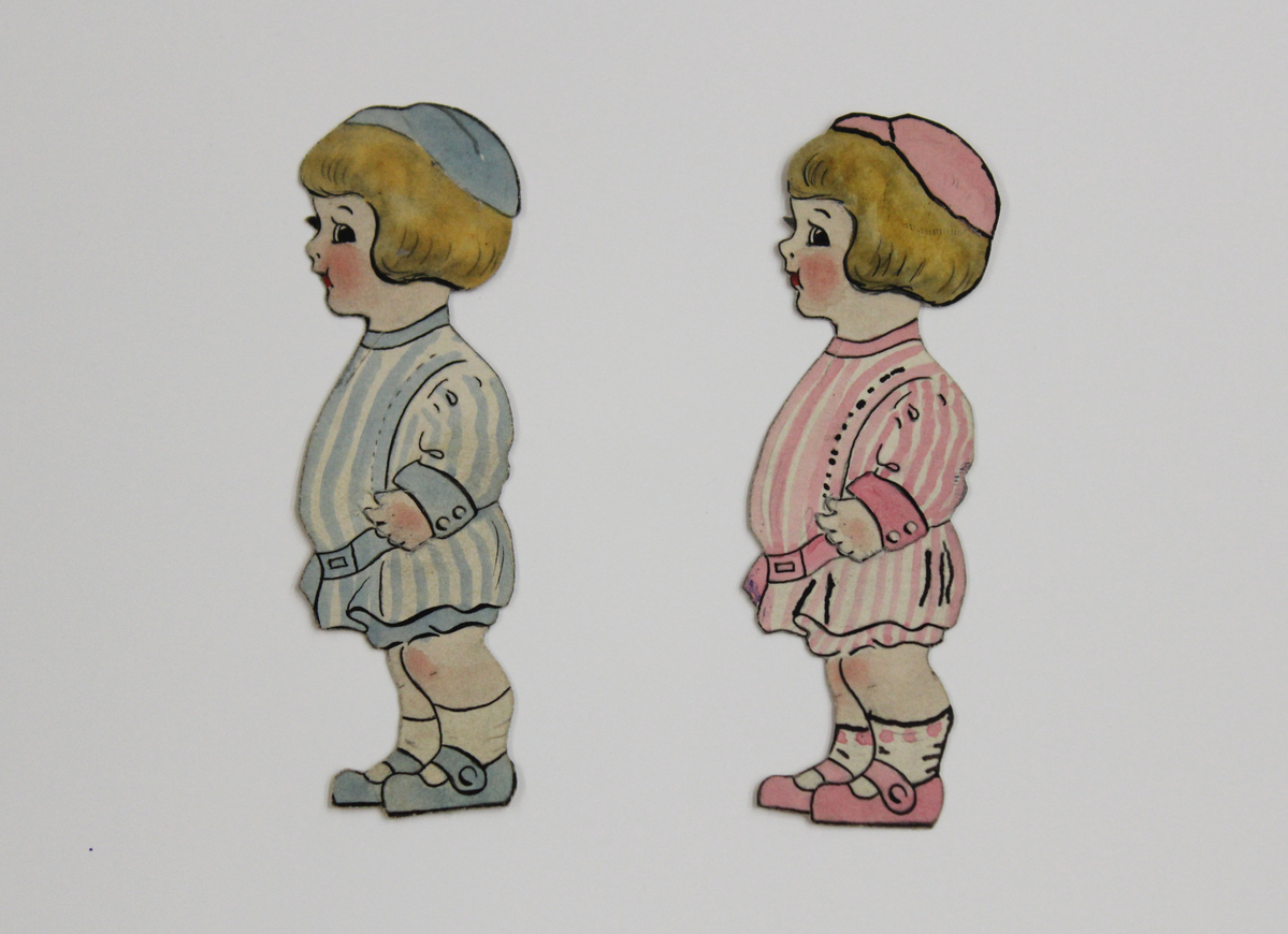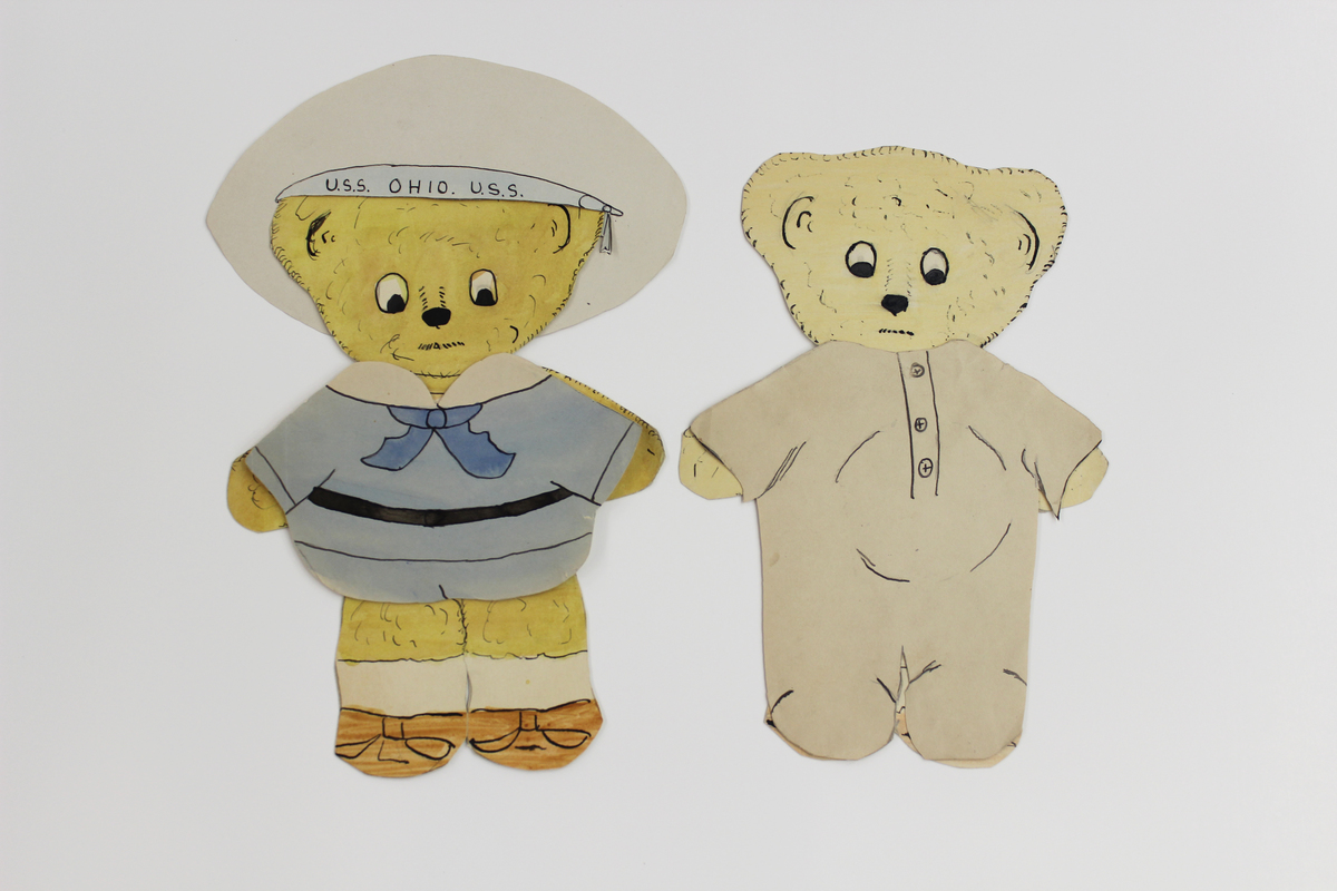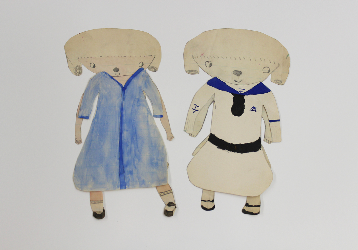 Three sets of largely handmade paper dolls and clothing items. A - Two ink and watercolor handmade paper dolls cut from card stock. The dolls are shaped like bears and decorated with underwear, socks, and shoes. Dolls are 8.5" tall and 6" wide. Includes 15 watercolor and ink robes and sailor outfits cut from regular paper, 4 sailor caps, 1 winter hat, and 2 full-length pairs of long underwear. B - Two ink and watercolor handmade paper dolls cut from lined paper. The dolls are shaped like dogs or lamps and decorated with underwear, socks, and shoes. The dolls are 8.75" tall and 4.25" wide. Includes 25 watercolor, pencil, and ink dresses and sailor outfits, 2 dressing gowns, 3 sweaters, and 9 hats, all cut from lined or plain paper. C - Two printed paper dolls with watercolor details made from thick paper. The dolls are identical and shaped like children, with one dressed in pink and the other in blue. The dolls are 3.25" high and 1" wide. Includes 9 handmade outfits and 9 handmade individual shoes, all painted in watercolor or decorated in crayon, and either pink, blue, or green. Enclosed in envelope marked "Dick's and Rob's Envelope."