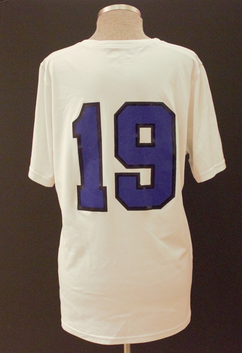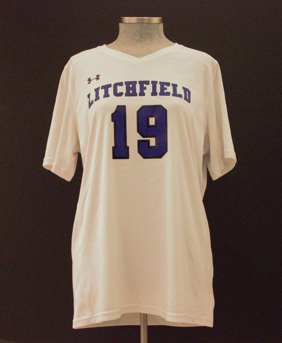 White women's jersey with black Under Armour logo on top right front. On front in blue with black outline, "LITCHFIELD / 19". On back, "19". Issued and used by Litchfield High School for soccer.