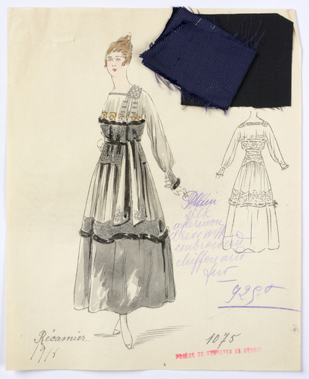 Lithograph and watercolor on paper fashion design. Plain silk afternoon dress with embroidered chiffon and fur. Fabric samples accompany rendering.