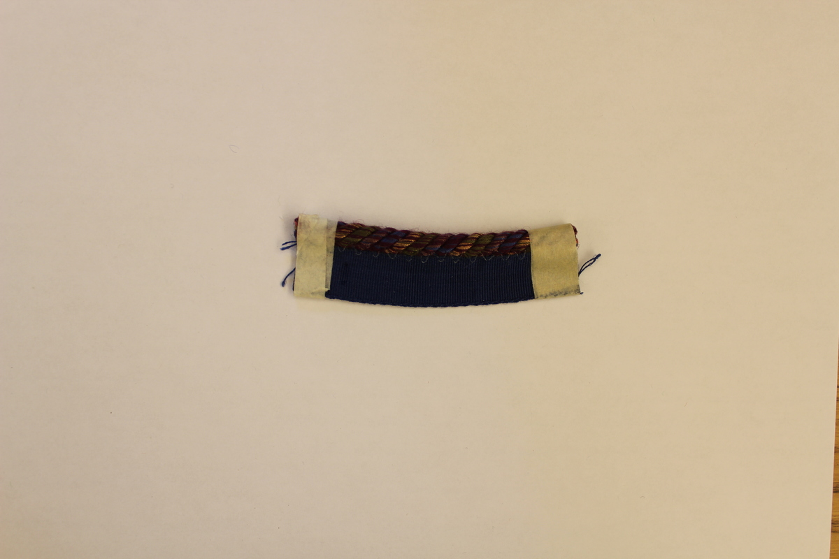 Strip of textile trim made of synthetic material. On the bottom, there is a wide blue strip. Attached to the top edge is a rope-like detail made of twisted purple, blue, green, and tan thread.