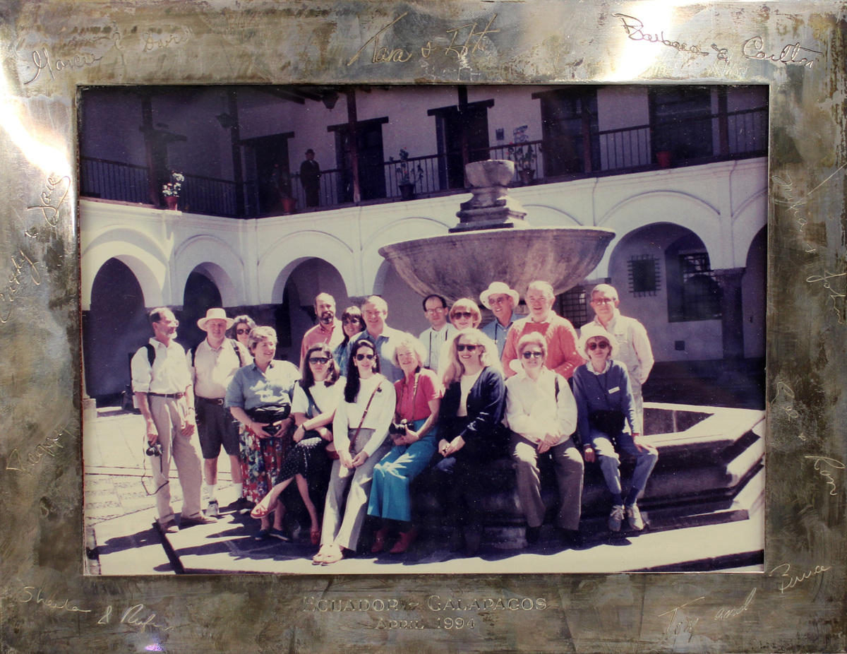 Color photograph set in engraved frame. 8.5" x 11" photograph showing a group of eighteen individuals posed around a large stone fountain. Background shows a stone courtyard set within a two-story structure with exterior balcony; white plaster arches and stone columns form the architecture of the first level, with exposed timber on the second level. Photograph is under glass in a plain, square, sterling silver frame. Engraved on face of frame are the signatures of the individuals pictures. Engraved at center on bottom, "Ecuador-Galapagos/April1994." Engraved on bottom edge of frame, at left, "(C) Cartier." Frame back covered in burgundy-colored leather, with gold lettering "Cartier."