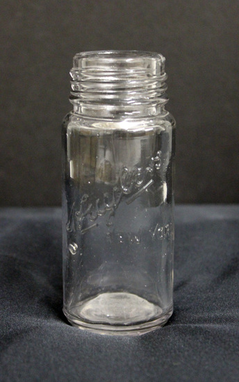 Cylindrical clear, glass bottle. "Huylers/ New York" impressed on one side. "3" impressed on bottom. Bottle is fitted for a screw-top lid that is missing.