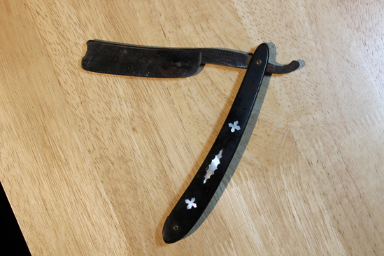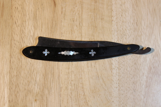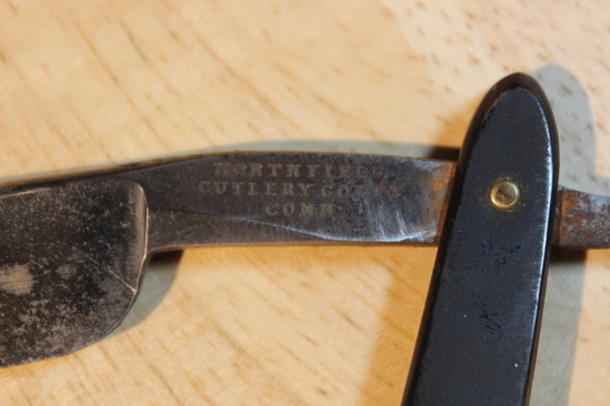 Straight razor. Steel blade stamped "NORTHFIELD/ CUTLERY COMPANY/ CONN." near handle. Black celluloid handle with mother-of-pearl decorative inlay on one side.