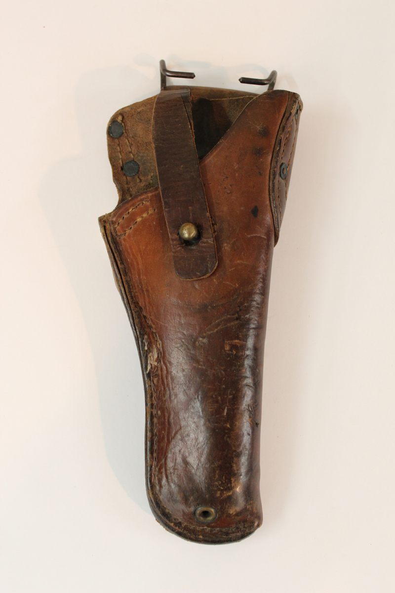 Dark leather pistol holster. Two slits and hooks for attaching to belt. Metal grommet at top. Leather strap with metal closure on the front. Inscribed in leather, the names of three battles: "GAVUTU", "TULAGI", and "GUADALCANAL."