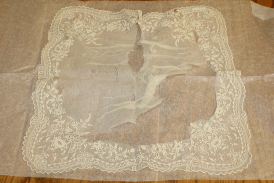 Delicate white mull handkerchief, rounded corners. Heavy embroidery around outer edge - floral design. Edge of handkerchief scalloped. "E.D. Deming" written in ink in center.