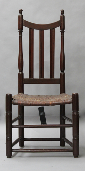 Side chair with three reeded vertical rails. Saddle crest rail. Turned front legs. Caned seat. Refinished with red stain.