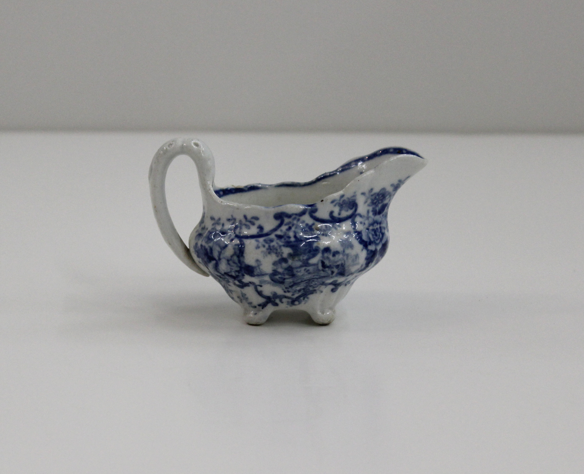 Glazed earthenware cream pitcher used as a toy or play teaware. White ceramic with blue transfer-printed decoration, high-bellied shape, curved handle and four feet. Identical scenes on either side, featuring four children seated by a large urn which holds a cluster of flowers and plants. There is a castle visible to the far right and a boat to the far left. The scene is surrounded by flowers, swags, and acanthus leaves. Molded floral motif on handle and blue geometric border on interior, scalloped edge.