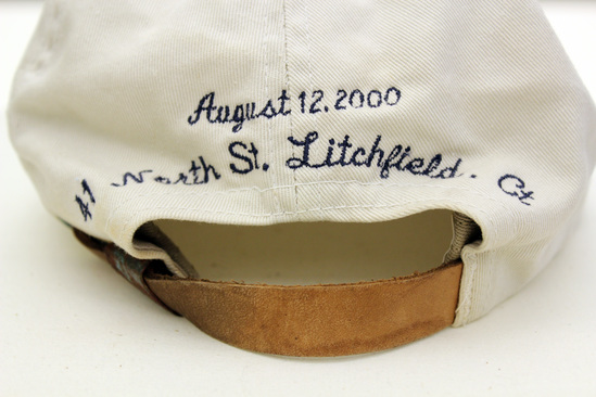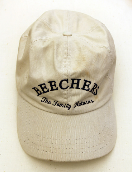 Light khaki color baseball cap (hat) with bill. "BEECHERS/ The Family Reunion" embroidered in dark blue across front. "August 12, 2000/ 41 North St. Litchfield, CT" embroidered in dark blue on back of hat above brown leather adjustable size strap.