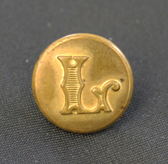 Round brass button. "L" stamped on front. "SCOVILL MFG CO." stamped on back.