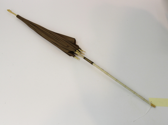 Parasol; folding; taupe silk cover with long ivory tips and black bone ribs; ivory painted wood handle; brass collar below slide over folding mechanism; carved ivory ferrule in shape of leaves; turned handle with repetitive pattern of decorative carved bands; small ivory cap at base of tube
