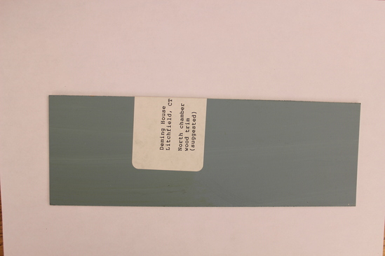 Blue paint sample of suggested color for the north chamber wood trim of the Deming house.