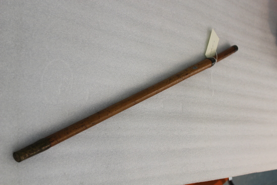 Walking stick with two part tapered wooden shaft with a silver collar at the joint; small rounded silver cap/handle and long brass tip. "DS" engraved at top of handle