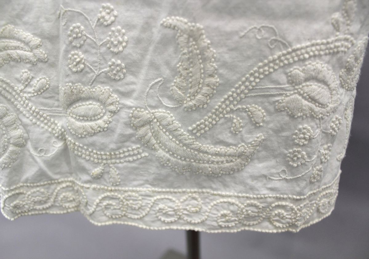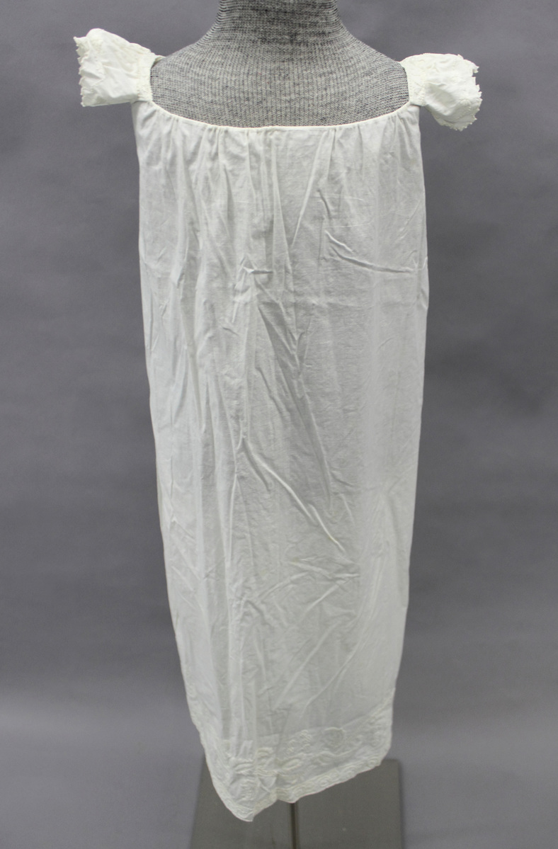 White cotton child's dress; square neckline with drawstrings; short sleeves with embroidery; embroidery at hem; center back short bodice with drawstrings; open all the way down the back with embroidered edges