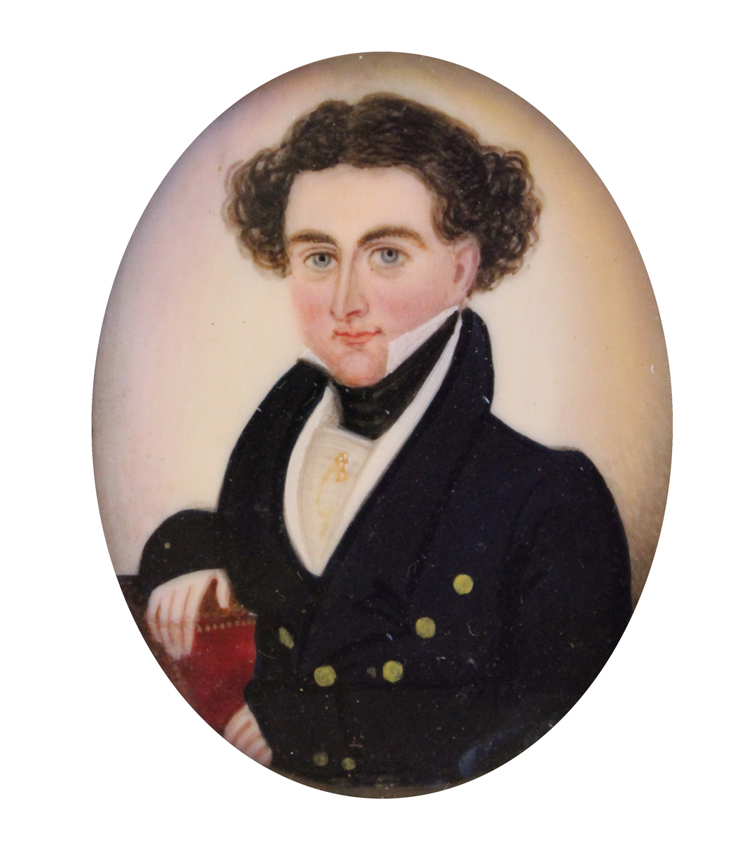 Watercolor on ivory portrait miniature of Benjamin Colden by Abraham Parsell. Half-length portrait of a young man wearing a dark blue jacket with gold buttons, a white shirt with high collar, a white stock with a gold pin or watch fab, and a black cravat or neckerchief. The man has curly brown hair and blue eyes and is seated on a red chair with his hand visible. Facing front left against a background of white, grey, and pink. Oval portrait set in elaborate brass locket under convex glass, with loop at top. Back of locket includes an empty hair reserve.