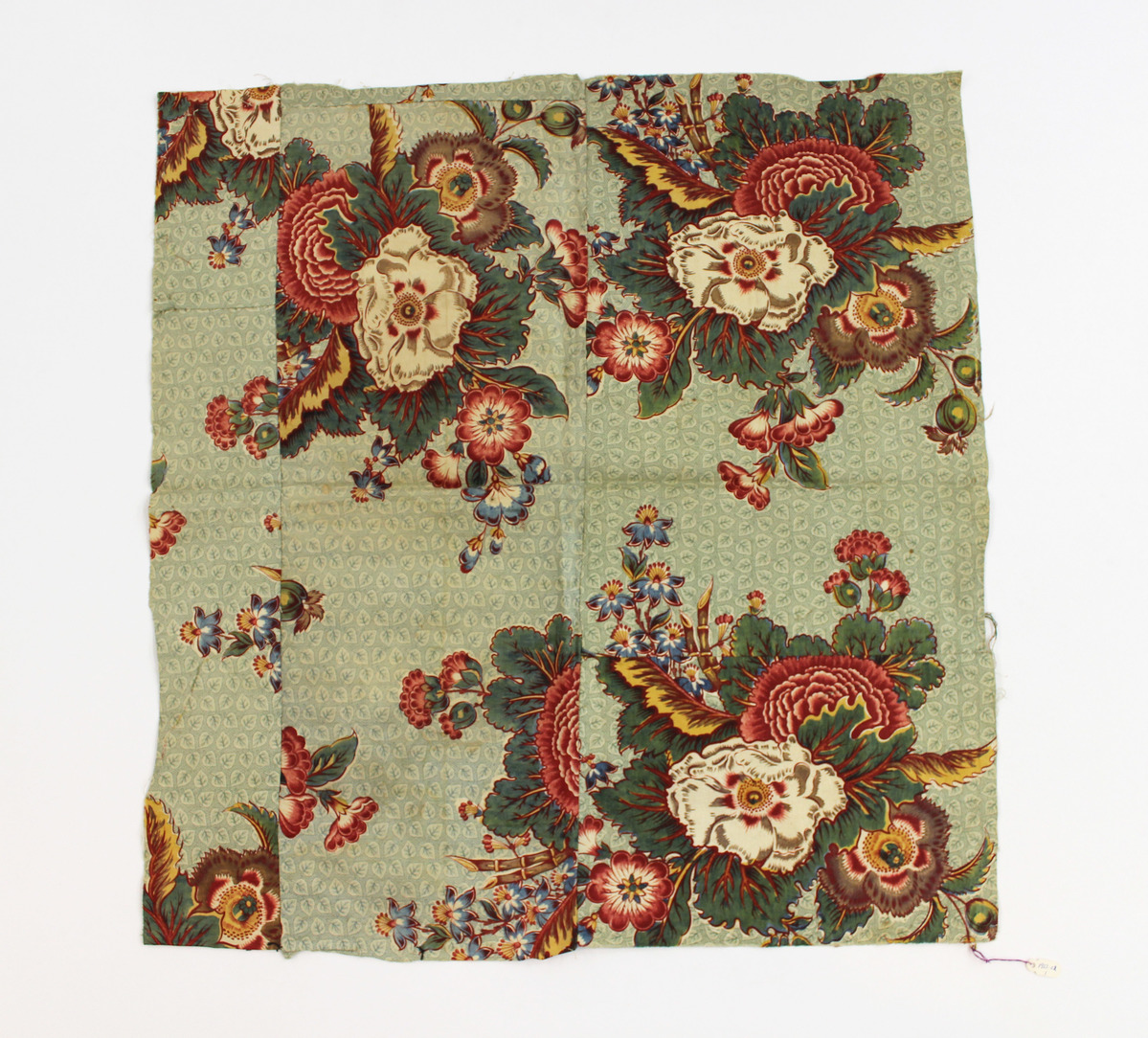 Square textile fragment with printed floral design. Fragment made up of multiple pieces of same cotton fabric, sewn together. The fabric features a green leaf pattern background with sections of large, floral designs in white, red, green, gold, and blue.