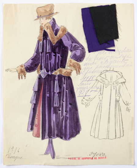 Lithograph and watercolor on paper fashion design. Evening or afternoon coat with trimmings and fur. Fabric samples accompany rendering.
