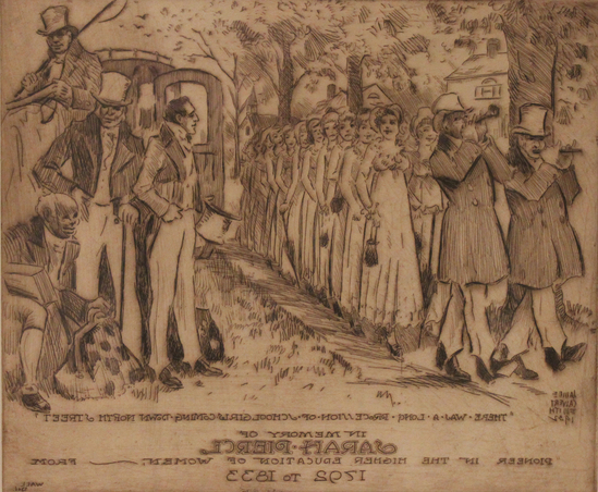 Print in reverse from etched plate. A procession of girls shown on right led by two men playing the flute and flagolet. On the left side of the composition are three men and a coach watching the girls. Printed in reverse below the scene are the words "There Was a long procession of school girls coming down North Street/ In Memory of/ Sarah Pierce/ Pioneer in The Higher Education of Women/ From/ 1792-1833." To the right of the title, printed in reverse, "James/ Calvert/ Smith/ 1932."