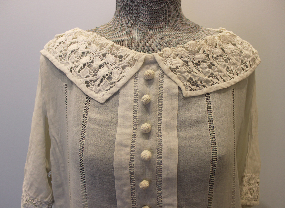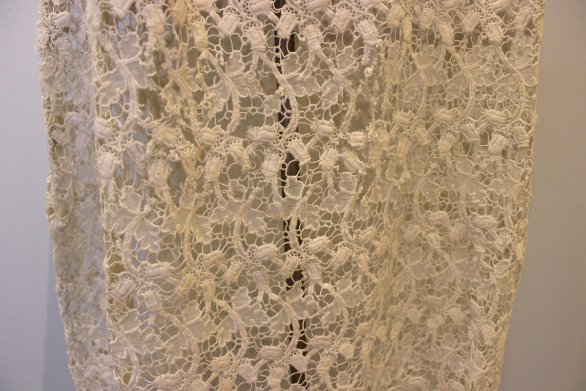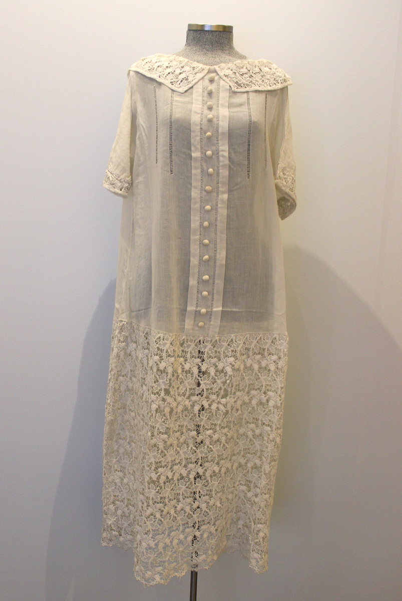 Off-white sheer voile dress. Straight, tubular shape. Four drawn work sections on bodice with 16 thread buttons on center-front faux placket. Short, straight sleeves with cut-work lace at hem. Flat collar of cut-work lace. Dropped waist skirt of cut-work lace.