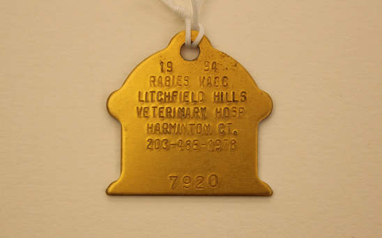 Orange, metal dog tag (license) in the shape of a squat fire hydrant. Tag is stamped, "1994/ RABIES VACC./ LITCHFIELD HILLS/ VETERINARY HOSP./ HARWINTON CT./ 203-485-1978/ 7920." A small hole is punched at the top.