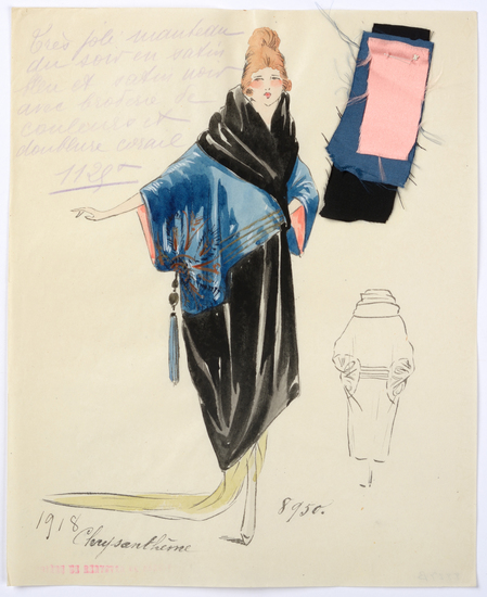 Lithograph and watercolor on paper fashion design. Evening coat in blue and black satin with embroidery of colors and a coral lining. Fabric samples accompany rendering.