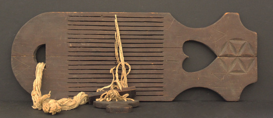 Wooden tape loom with spun wool looped at end and across center. Loom rounded at top with semi-circle window cut below. Vertical slats cut through center of loom with a heart shaped window cut out below. A "P" is carved above the heart with an "M" and "V" carved to the left and right below the heart. In the center below the heart is carved a circular decoration.