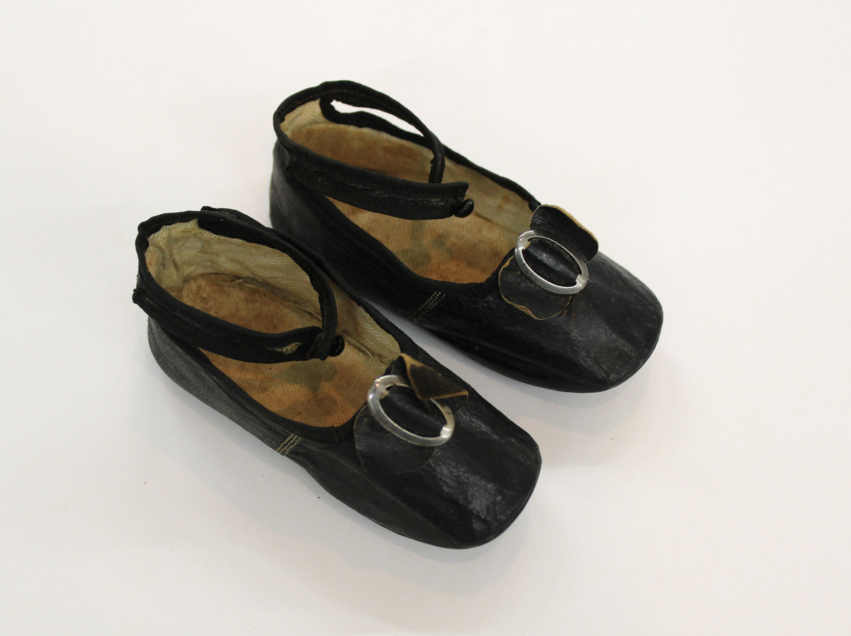 Pair of black leather child's shoes; ankle straps with wood button closure; leather bow with metal buckles on top; white cotton twill lining; brown leather soles