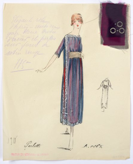 Lithograph and watercolor on paper fashion design. Afternoon dress in blue gauze embroidered with steel and beads on background of red satin. Fabric samples accompany rendering.