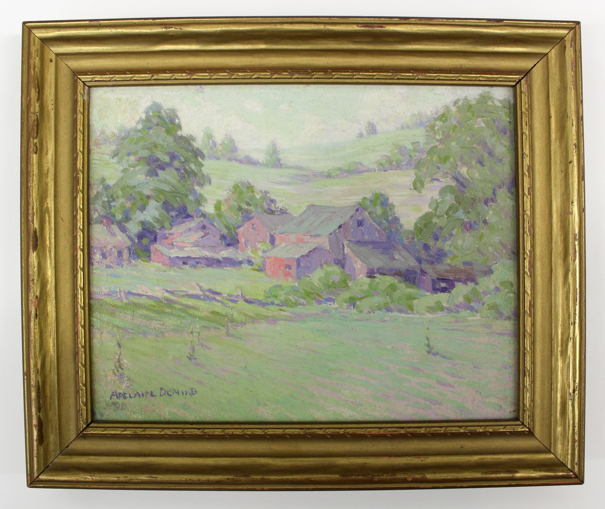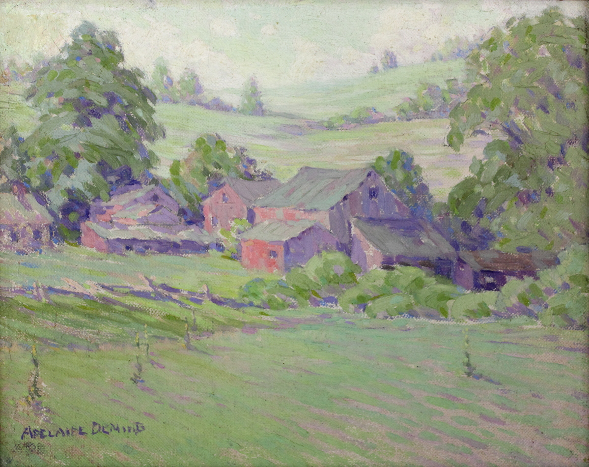 Oil on canvas painting of a landscape scene. Multiple barns and outbuildings visible in the middleground, painted in shades of red, purple, and pink. Field of grass in pinks and greens in the foreground, with trees and rolling hills in the background stretching towards a sky of greens and whites. Signed at lower left, "ADELAIDE DEMING." Painting framed in gilt wood frame with incised decoration around interior. On reverse, paper label affixed to stretcher, "Old Barns at Litchfield/Artist: Adelaide Deming/Litchfield, Conn." in ink with pencil above "Switzers" and below "Possibly to Mrs. Lindt." In pencil on upper stretcher, "Perkins."