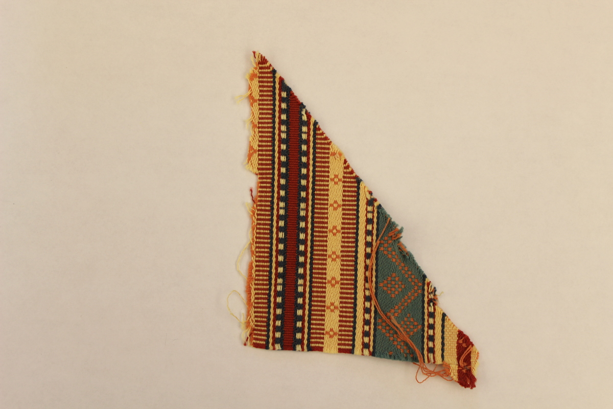 Triangular piece of fabric made of cotton. Swatch has vertical lines of differing widths. Stripe patterns include red with thin tan horizontal stripes, thin red, tan and blue stripes, blue with small white squares, tan with small orange crosses running vertically down the stripe, and turquoise with an orange zig-zag design made up of dots. Stripes are embroidered on and raised from the background.