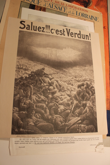 White World War I era poster. Central image depicts a city floating in the sky over mounds of dead soldiers. "Saluez!!! c'est Verdun!" in black letters at top.