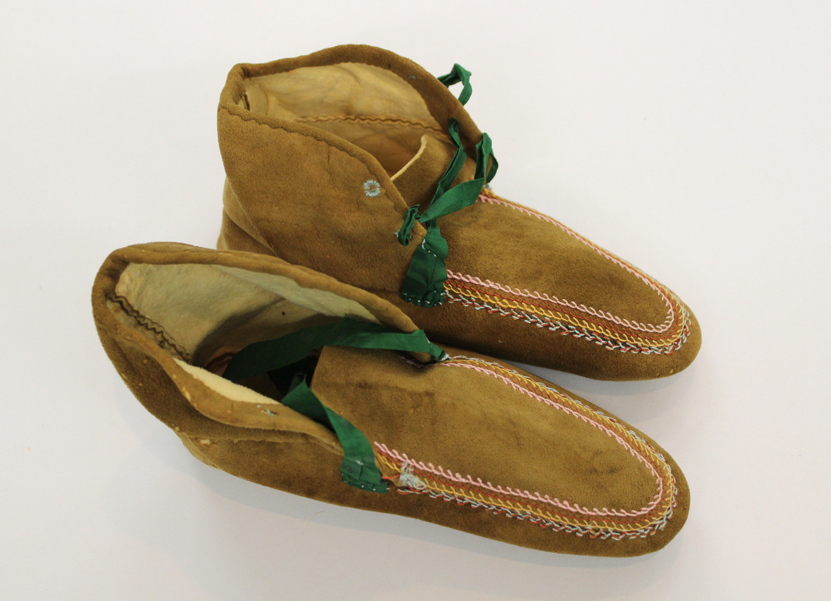 Pair of light brown suede child's moccasins; pointed toes; decorative stitching along front seams in pink, yellow, blue and orange; green silk ribbon ties; two eyelets for lacing; unlined