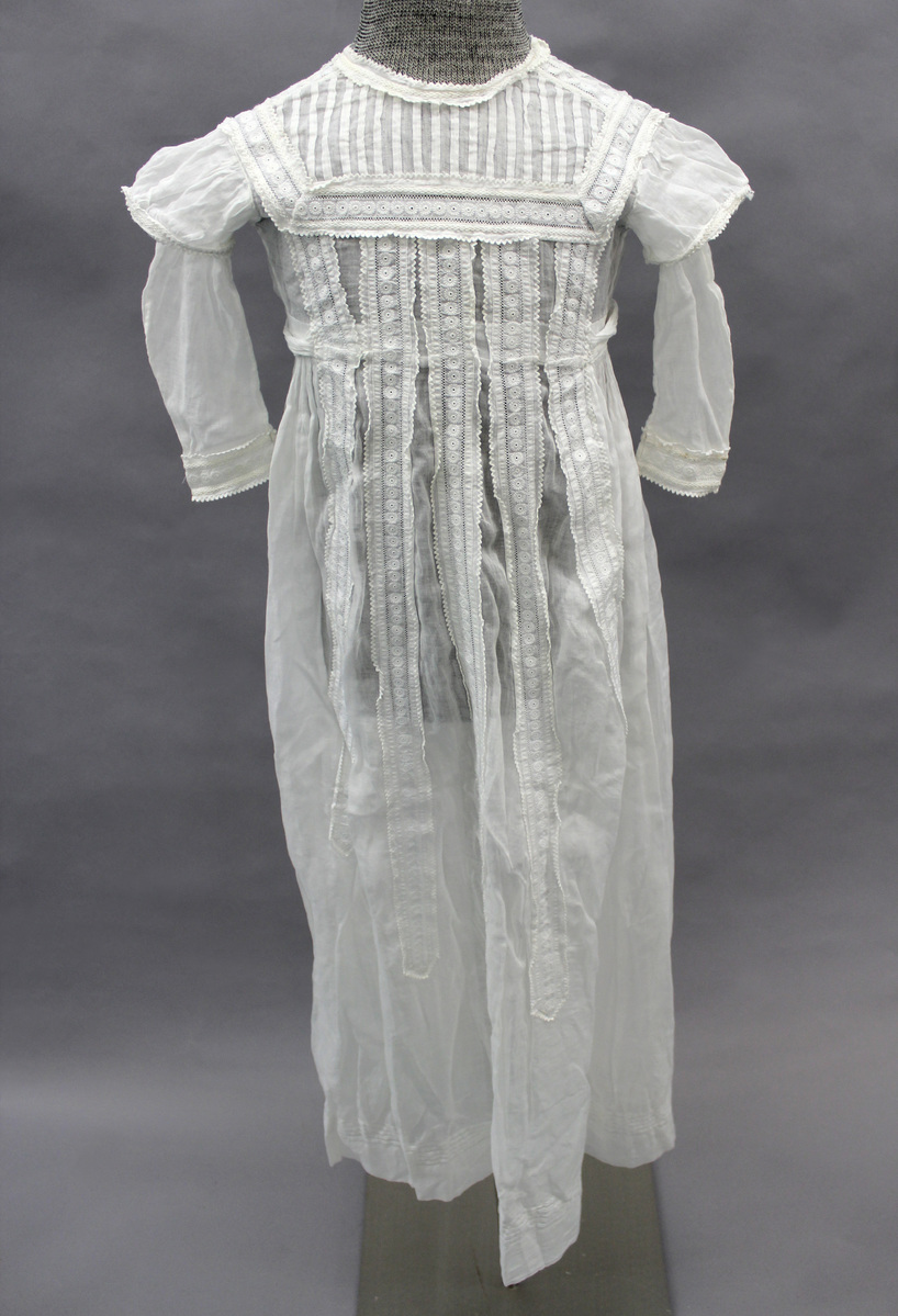White cotton child's dress; long sleeves with embroidered lace cuffs and short puff sleeves; square yoke with tucks trimmed with embroidered lace; five box pleats with embroidered lace down the center front; tucks at hem, tied sash; drawstrings at waist; two fabric covered buttons at center back for closure