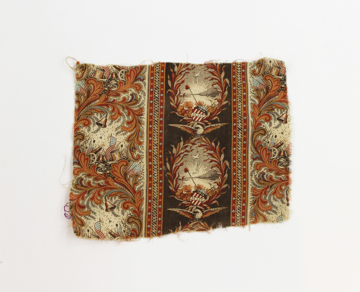 Textile fragment with four cut edges and printed patriotic motifs. Alternating white and brown vertical bands, the white containing paisley motifs surrounding scenes of cannons, flags, drums, and the Liberty Bell, and the brown containing laurel wreaths surrounding a sunrise scene with an eagle at the top and American centennial shield at the bottom. The two are separated by thin red stripes with stars and brown stripes with repeating text "Our lives, our fortunes, and our sacred honor" and "Life, liberty, and the pursuit of happiness." Roller printed fabric.
