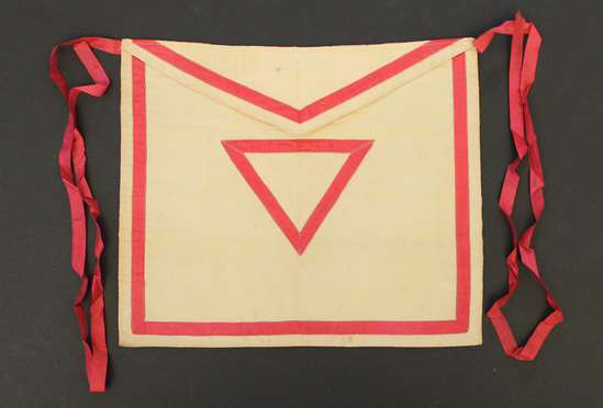 Plain off-white cotton Masonic apron. Backed in white linen. Apron trimmed with pink silk ribbon. Matching silk ribbon used for triangle decoration on front and for ties.
