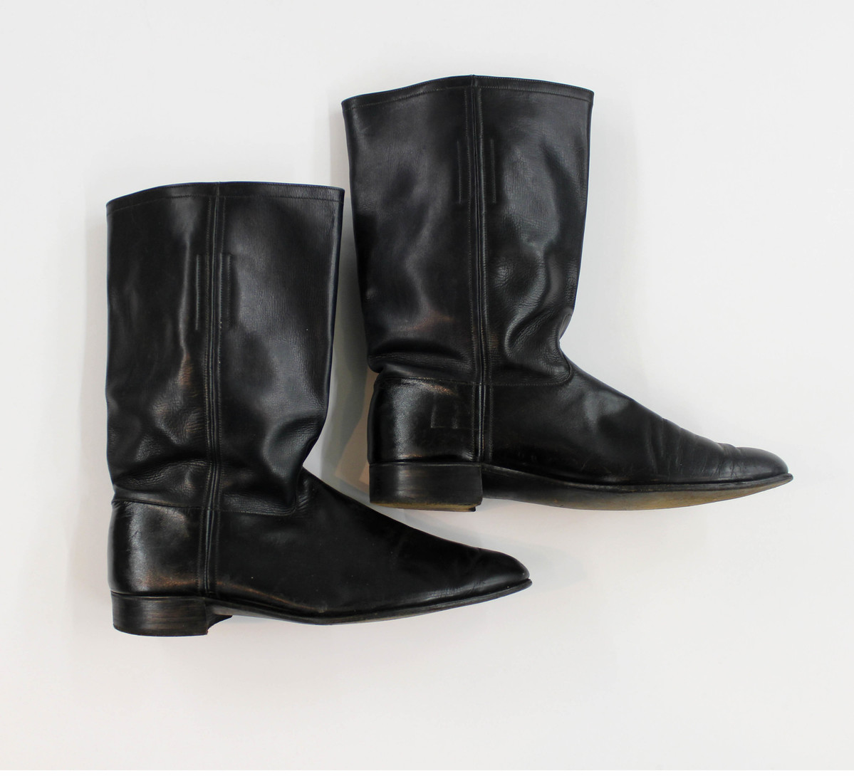 Black leather men's US Navy dress boots. Slip-on style. Unlined. Light blue cotton twill tape loops on inside both sides.